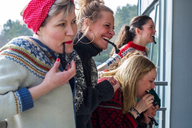 Foto fra ett av de internasjonale strikketreffene på Bårdshaug Herregård hvor vi var prosjektleder. Her var det deltakere fra USA og Europa.